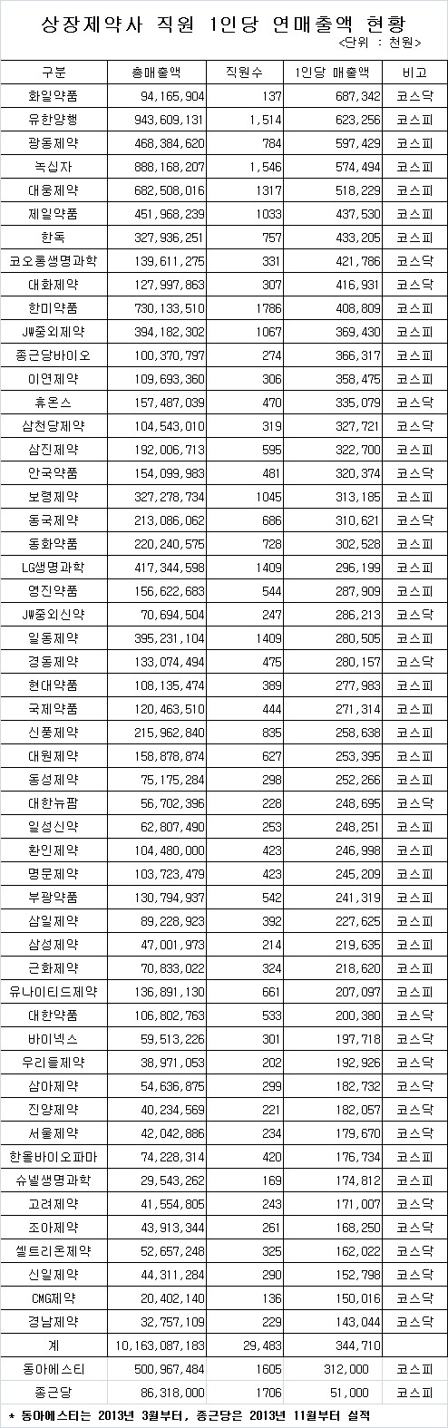 상장제약사에 종사하는 직원들의 1인당 연매출액은 3억 4,500만원으로 집계됐다.