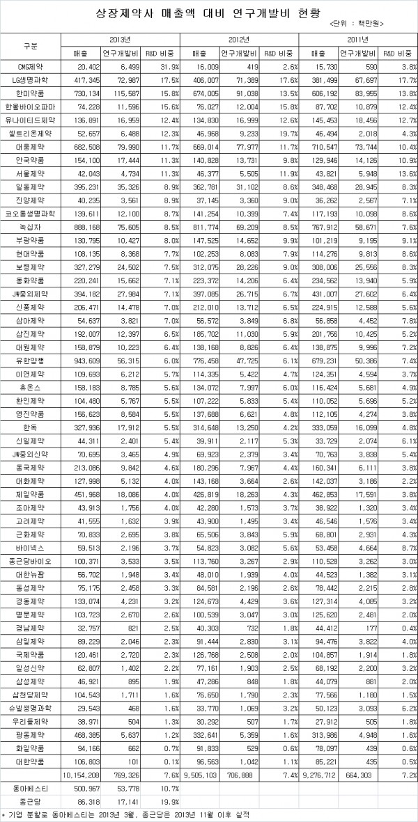 특히 한미약품은 제약업계 최초로 연간 1,000억원이 넘는 비용을 연구개발비로 투자한 것으로 파악됐다.