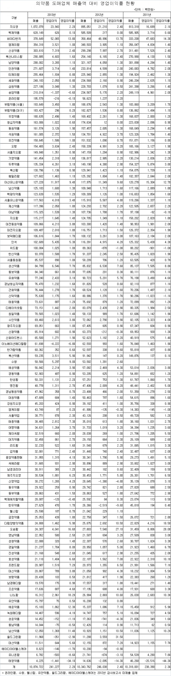 약업닷컴(www.yakup.com)이 12월 결산 의약품 도매업체들이 금융감독원에 제출한 감사보고서를 분석한 결과, 107개 업체들의 영업이익률은 2.2%로 나타났다.