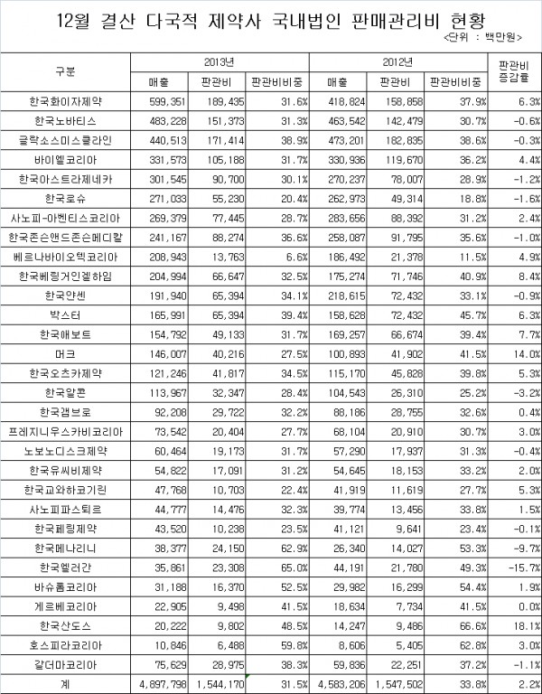 약업닷컴(www.yakup.com)이 국내에 진출해 있는 12월 결산 다국적 제약사 30곳의 2013년 감사보고서를 분석한 결과, 매출액 대비 판매관리비 비중은 평균 31.5%였다. 이는 지난 2012년의 33.8%에 비하면 2.2%p 낮아진 것이다.