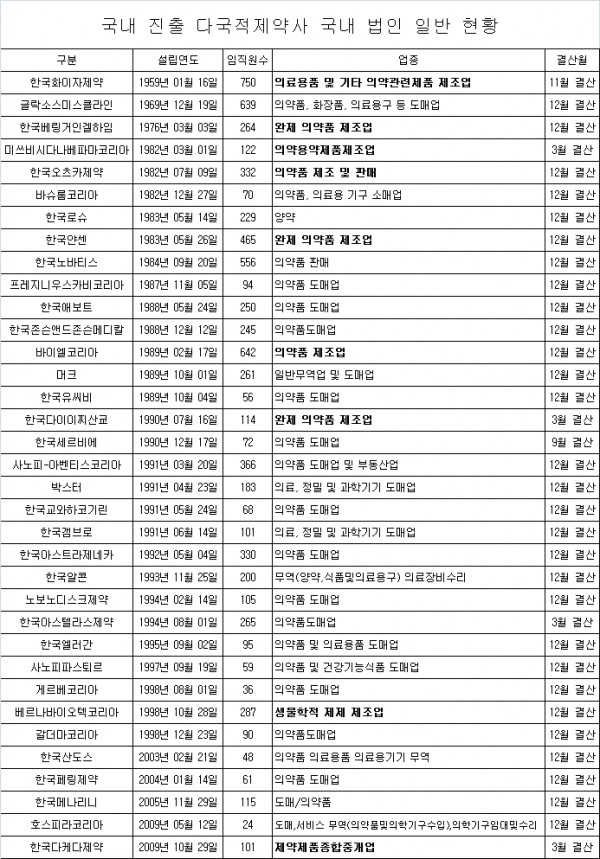 한편, 국내에 진출해 있는 기업중 유한회사인 한국릴리, 한국엠에스디, 한국비엠에스, 한국먼디파나는 감사보고서 제출 의무가 없어 조사에서 제외했다.