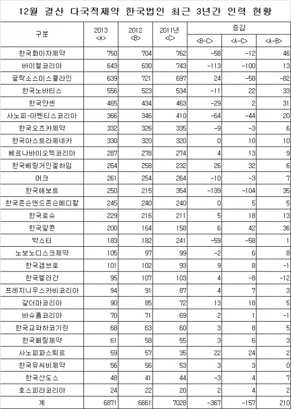 지난 2011년에 비해 2012년에 직원수가 무려 367명 줄었다는 것은 다국적제약사 국내법인이 대규모 인력 조정을 실시했기 때문으로 풀이된다.