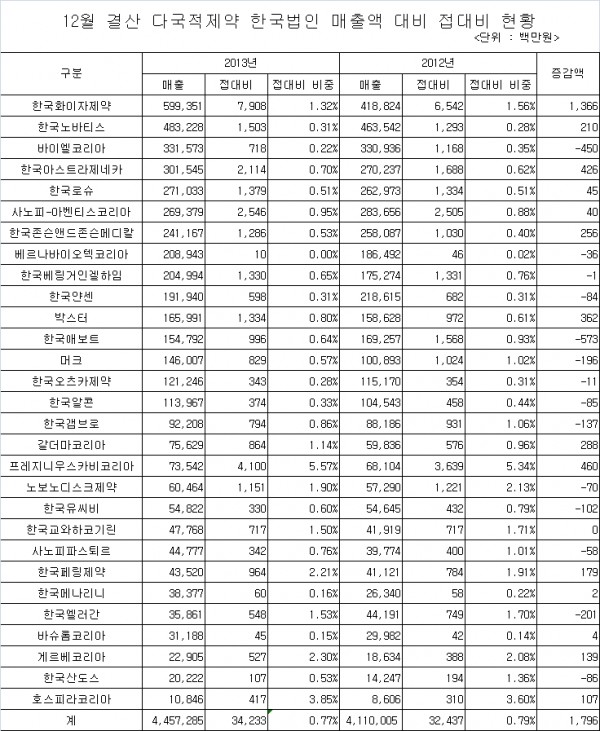 접대비 지출이 가장 많은 업체는 한국화이자제약으로 012년보다 접대비가 13억 6,600여만원 늘어난 79억 800여만원이었다. 뒤를 이어 프레지니우스카비코리아 41여억원, 사노피-아벤티스코리아 25억 4.500여만원, 한국아스트라제네카 21억 1,000여만원 등이었다.