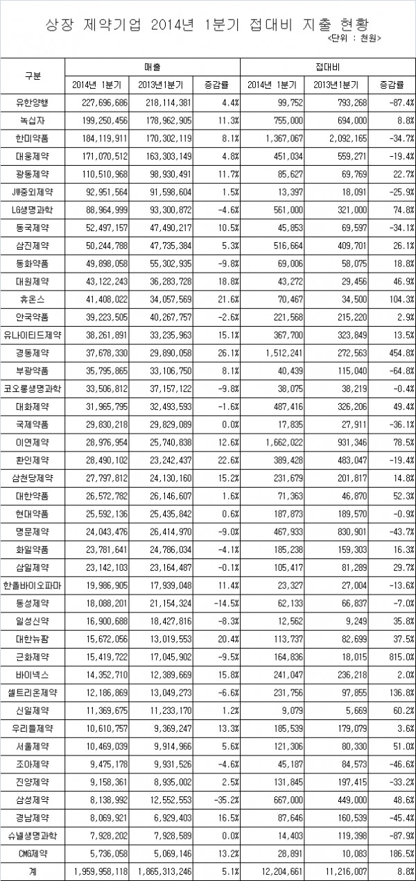 약업닷컴(www.yakup.com)이 코스피 및 코스닥 상장 제약사들이 금융감독원에 제출한 2014년 1분기 보고서를 분석한 결과, 이들 업체들의 접대비 지출은 지난해 1분기에 비해 평균 8% 증가한 것으로 파악됐다.