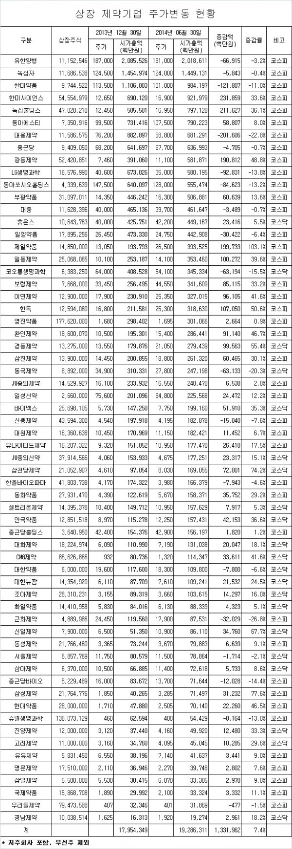 올해들어 상장제약사의 주가가 평균 7.4% 올랐으며, 시가총액은 1조 3,300여억원이 증가한 것으로 파악됐다.