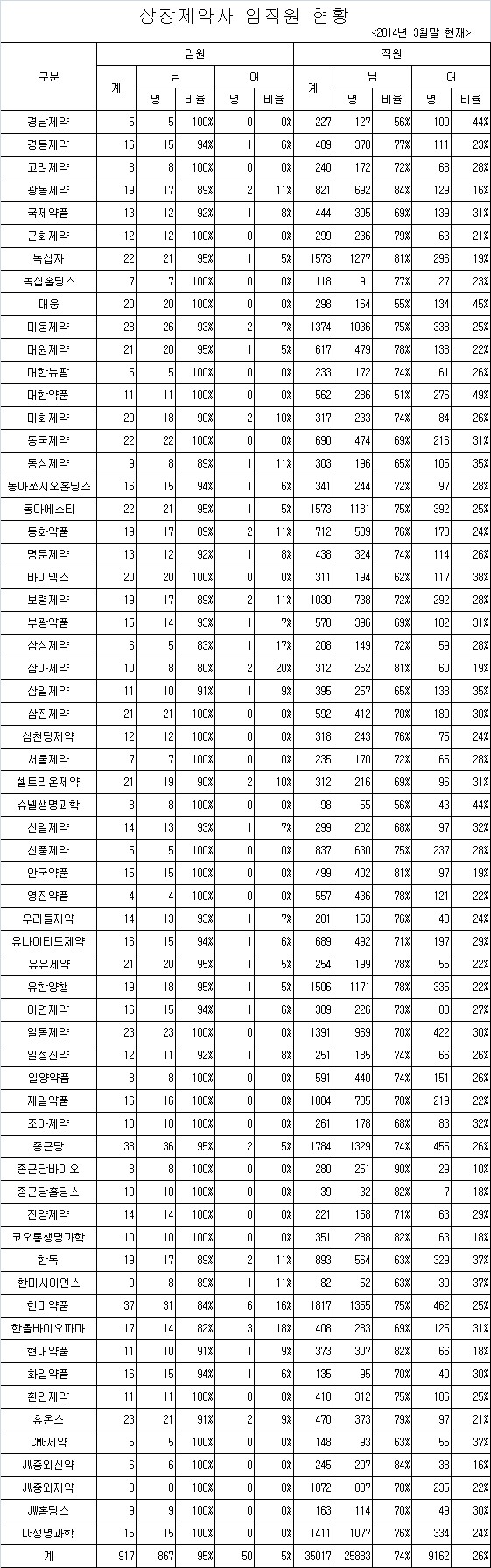약업닷컴(www.yakup.com)이 코스피 및 코스닥 상장 제약사 63개사의 2014년 3월 기준 임원(등기, 미등기 포함) 현황을 분석한 결과, 여성 임원의 비율은 5%에 불과한 것으로 나타났다.