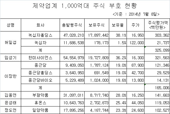 약업닷컴(www.yakup.com)이 7월 8일 기준으로 상장제약사 오너의 주식보유현황을 분석한 결과, 주식 평가액이 1,000억원이 넘는 오너는 총 6명으로 나타났다.