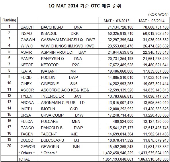 최근 1년간(2013년 2,3,4분기-2014년 1분기) OTC 매출을 집계한 IMS데이타에 따르면 이 기간 중 전체 OTC시장은 1조8,639여 억원으로 집계됐다. 이는 전기(2012년 2,3,4분기-2013년 1분기) 1조8,511억9천여 만원보다 소폭 증가한 수치다.