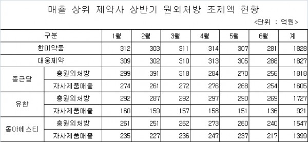 상반기 원외처방 조제액 시장 1위를 놓고 한미약품, 대웅제약, 종근당이 박빙의 승부를 벌인 것으로 나타났다.