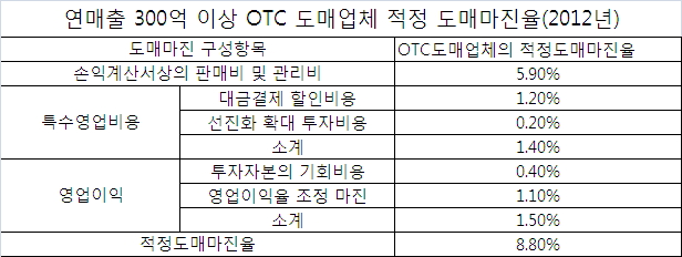 조사결과 연 매출 300억원 이상 국내 OTC 도매사들의 수익성은 2012년도에 매출영업이익율 1.3%, 매출액순이익율 1.0%로 국내 전체 도매 및 상품중개업에 비해 각각 1.1% 및 0.7% 낮은 수준에 있는 것으로 지적됐다.
