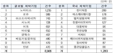 같은기간 출원 상위 10개 글로벌 제약기업은 6,968건의 특허를 출원했다. 국내사의 출원건수는 글로벌 제약기업의 18.4% 수준인 것이다.