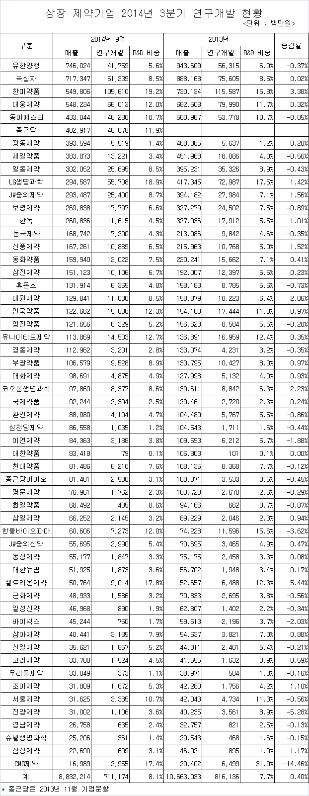 상장제약사중 매출액 대비 연구개발비 비중이 가장 높은 업체는 한미약품은 19.2%, 금액으로는 1,000억원을 넘었다. 한미약품은 2014년 3분기 별도 연구개발비용은 939여원으로 매출액의 22.4%라고 설명했다.