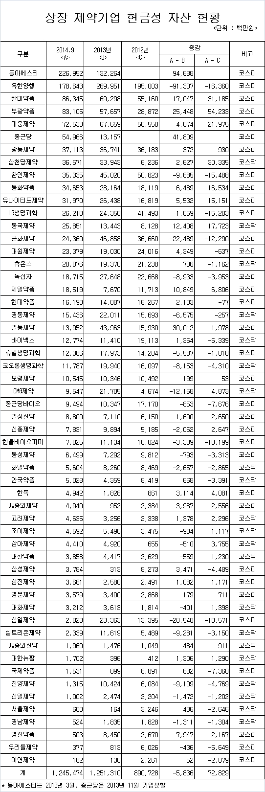 약업닷컴(www.yakup.com)이 2014년 9월말 현재 상장제약사 55곳이 보유하고 있는 현금 및 현금성 자산을 집계한 결과 총 1조 2,455억원으로 지난해 말의 1조 2,513억보다 소폭 감소했다.