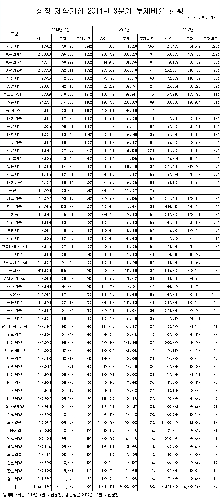 약업닷컴(www.yakup.com)이 상장제약사들의 2014년 3분기 보고서를 분석한 결과, 평균 부채비율은 58%로 나타났다.