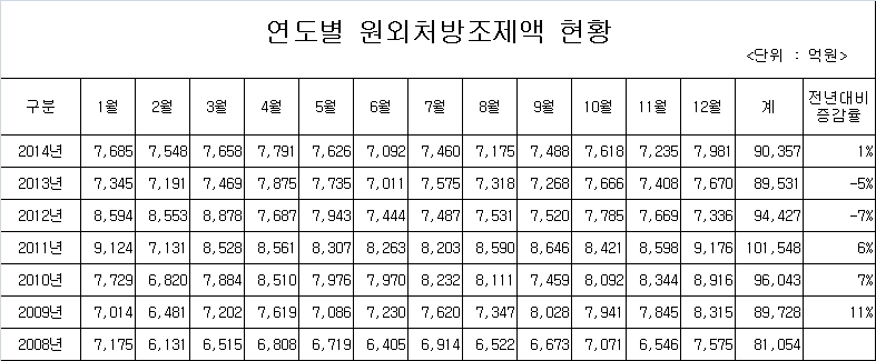 각 증권사들이 유비스트의 자료를 분석한 결과, 지난해 원외처방조제액은 9조 357억원으로 2013년의 8조 9,531억원보다 소폭 늘어났다.