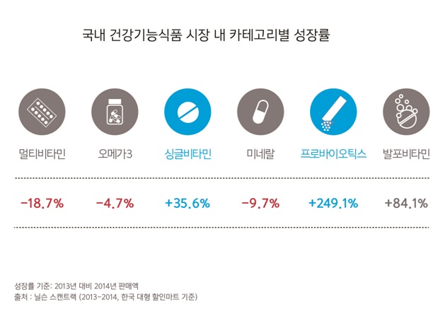 프로바이오틱스의 대형마트 내 판매액은 2014년에 전년 대비 249.1% 증가하는 '세 자릿 수 성장'을 기록했다. 발포 비타민(+84.1%)과 싱글 비타민(+35.6%)도 각각 전년 대비 두 자릿 수 성장을 기록했다.