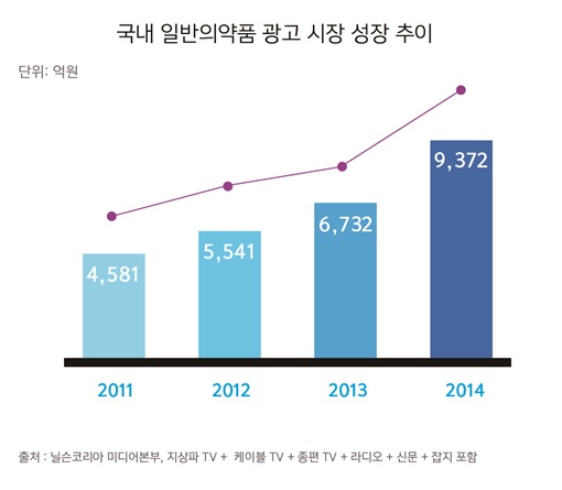 장기화되는 내수 침체 속에 대표적인 내수 시장 가운데 하나인 국내 광고시장이 2014년에 전년 대비 2.9% 역성장한 것으로 나타났지만, 일반의약품 광고 시장은 2013년 6,732억 원에서 2014년 9,372억 원으로 39.2% 성장한 것으로 나타났다.
