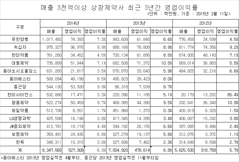 약업닷컴(www.yakup.com)이 매출 3000억원 이상 제약사들의 지난해 영업실적을 분석한 결과, 영업이익률은 평균 6.3%로 집계됐다. 매출액 대비 영업이익률은 기업의 주된 영업활동에 의한 성과를 판단하는 잣대로 활용된다. 제조 및 판매활동과 직접 관계가 없는 영업외 손익을 제외한 순수한 영업이익만을 매출액과 대비한 것이다.