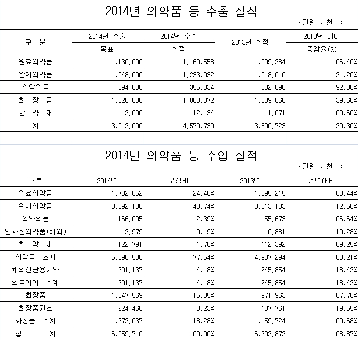 반면 의약품 등의 수입은 69억 5,971만달러로 2013년의 63억 9,287만달러에 비해 8.87% 증가했다. 의약품 수입보다 수출 증가세가 두드러지고 있지만 의약품 수출수입 역조현상은 여전하다는 지적이다.