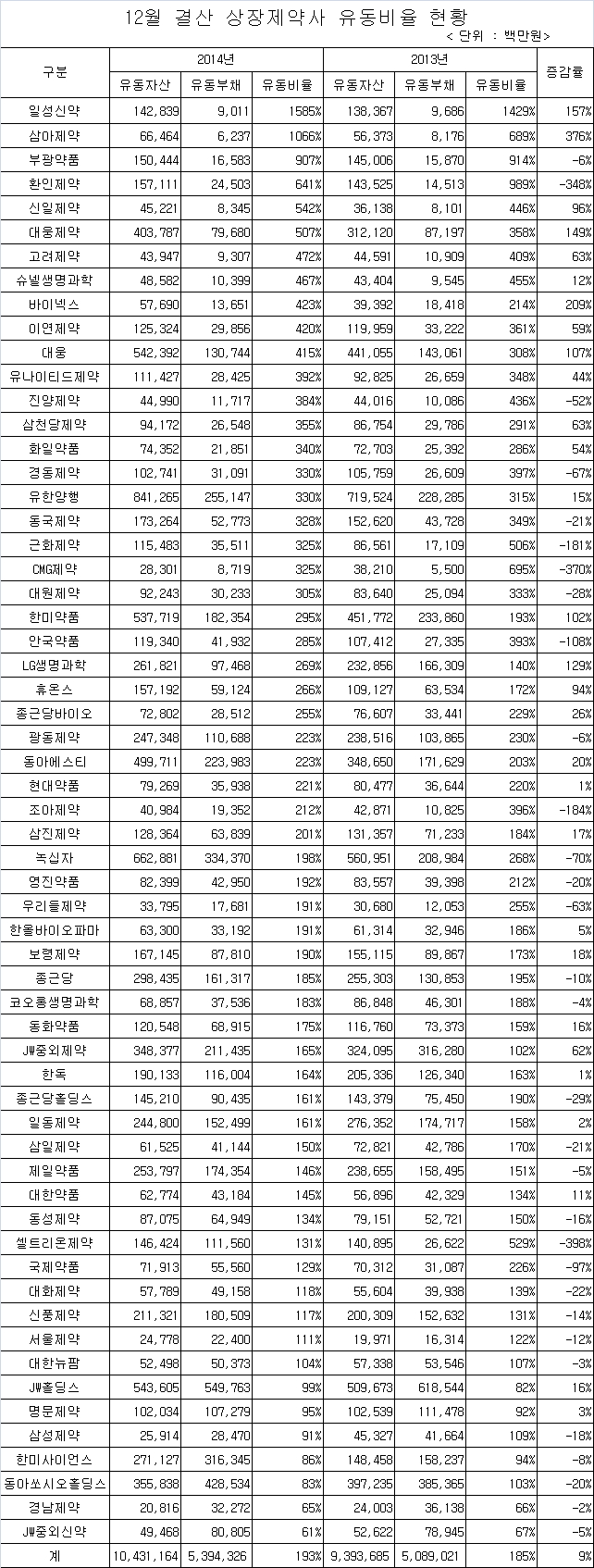 유동비율이 가장 높은 곳은 일성신약으로 1,585%였으며, 뒤를 이어 삼아제약 1,066%였다. 또 현금동원력이 양호한 것으로 평가받는 유동비율 200%를 넘는 업체는 총 31곳 분석됐다.