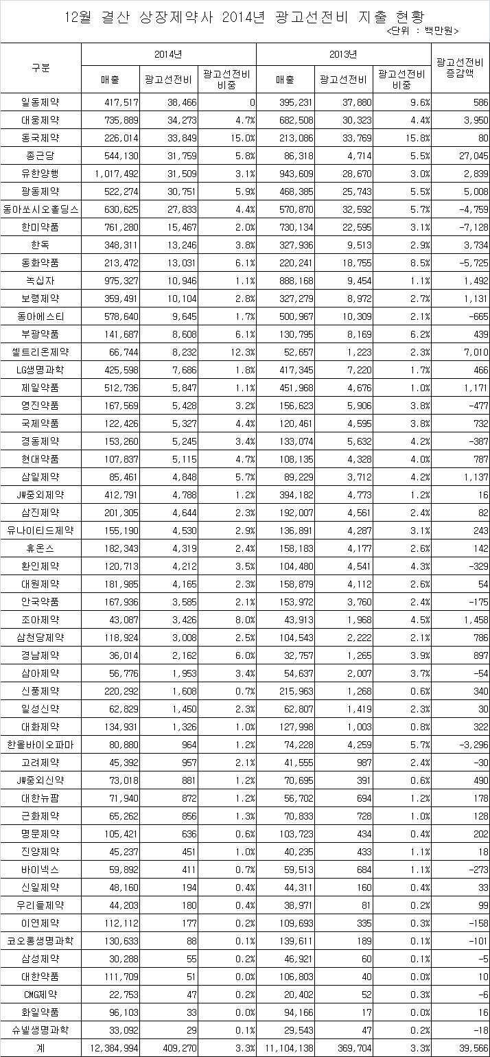 지난 2013년에 비해 연간 광고선전비를 10억원이상 늘린 기업은 셀트리온제약, 광동제약, 대웅제약, 한독, 유한양행, 녹십자, 조아제약, 제일약품, 삼일제약, 보령제약 등으로 조사됐다.