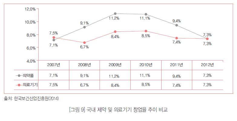 보고서의 제약 및 의료기기 분야 헬스케어 창업 실태조사 결과에 따르면, 헬스케어 분야 창업률은 2008년 7.4%에서 2009년 9.1%로 상승했다. 이후 2010년 9.2% 최고치 기록 이후 꾸준히 하락해 2012년 현재 7.3%를 기록하며 7%대 수준을 유지하고다.