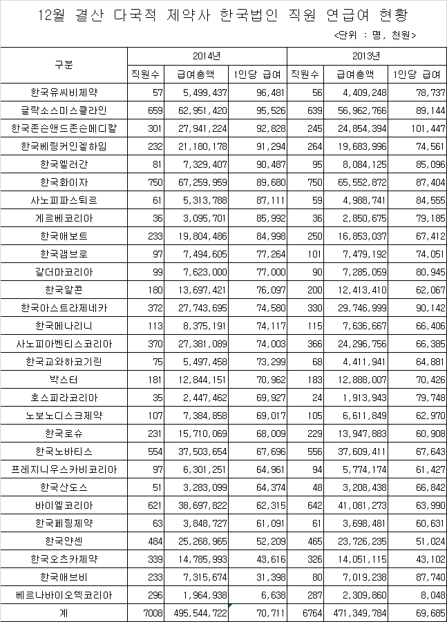 약업닷컴(www.yakup.com)이 12월 결산 다국적 제약사 한국법인 29개사가 금융감독원에 제출한 2014년 감사보고서를 분석한 결과, 직원 1인당 연평균 급여는 7,071만원으로 집계됐다.