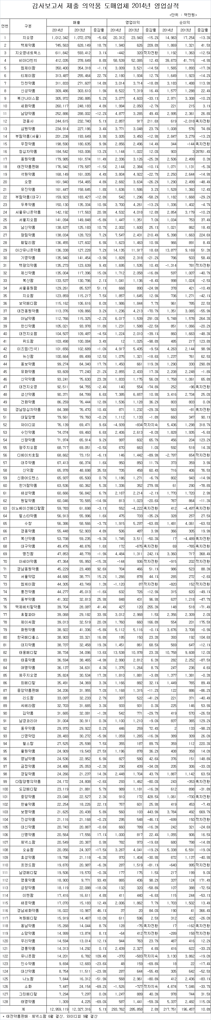 약업닷컴(www.yakup.com)이 금융감독원에 감사보고서를 제출한 128개 의약품도매업체들의 2014년 영업실적을 분석한 결과, 매출은 2013년 대비 평균 5.1% 증가한 것으로 조사됐다.
