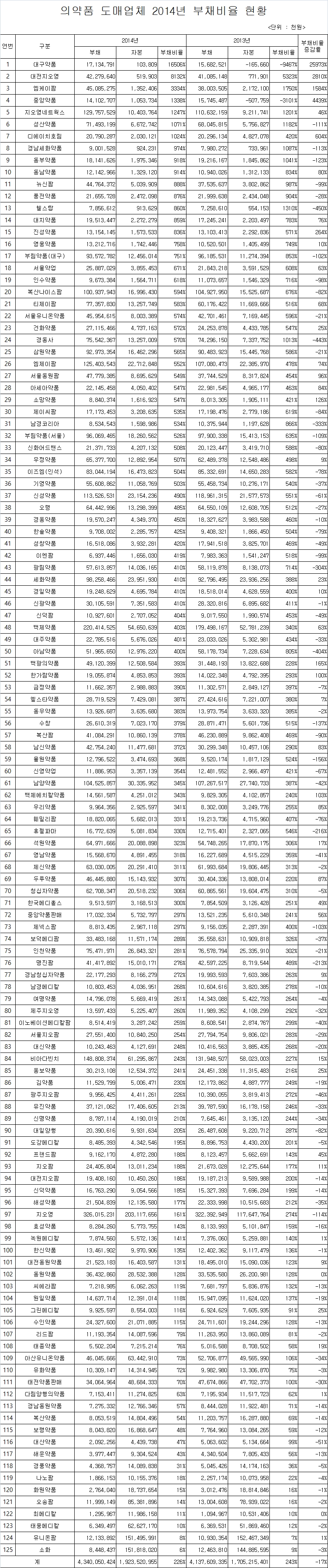약업닷컴(www.yakup.com)이 금융감독원에 감사보고서를 제출한 125개업체의 2014년 재무구조를 분석한 결과, 평균 부채비율은 226%로 조사됐다.