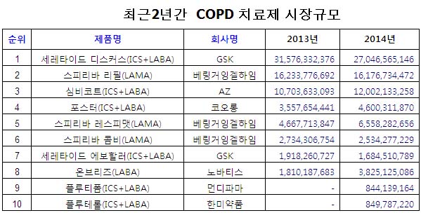 COPD(만성폐쇄성폐질환) 치료제 전체시장 규모는 약 1천억대 내외로 추정되고 있으며 쌍두마차는 세레타이드(GSK)와 스피리바(베링거인겔하임)이다. 이 두 제품을 포함 상위 10대제품의 매출이 전체시장의 약 75%이상을 점유하고 있다