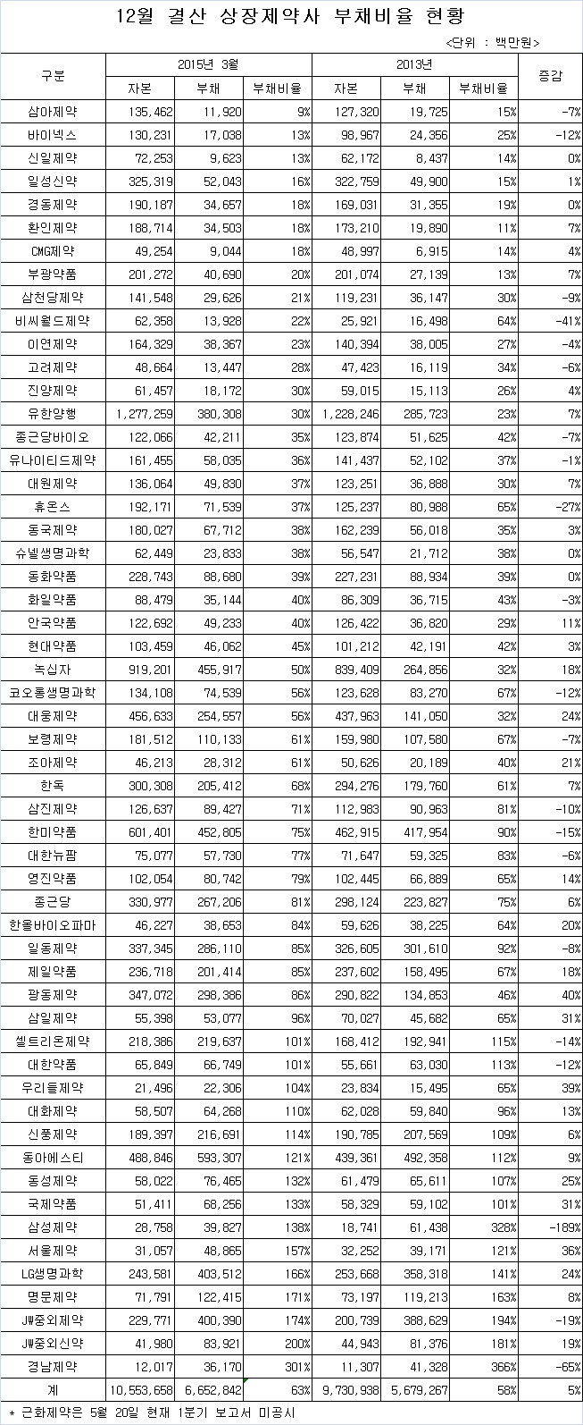 뒤를 이어 JW중외신약 200%, JW중외제약 174%, 명문제약 171%, LG생명과학 166%, 서울제약 157%, 삼성제약 138%, 국제약품 133%, 동성제약 132%, 동아에스티 121%, 신풍제약 114%, 대화제약 110%, 우리들제약 104%, 대한약품 101% , 셀트리온제약 101% 등 부채비율 100% 넘는 제약사는 총 15곳으로 파악됐다.