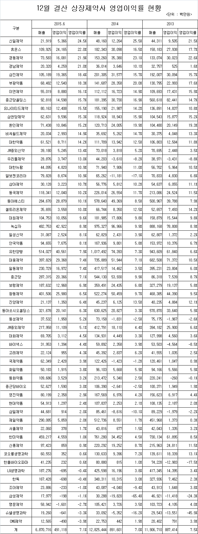 또 영업이익률이 2%도 못미치는 업체는 한올바이오파마, 코오롱생명과학, 신풍제약, 한미약품, 서울제약, 제일약품 등이었다.