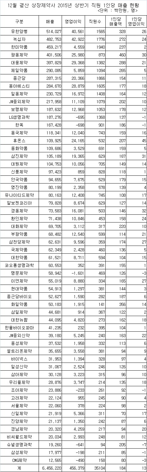 약업닷컴(www.yakup.com)이 12월 결산 코스피 및 코스닥 상장 제약사의 2015년 상반기 영업실적을 분석한 결과, 상반기 1인당 평균 매출액은 1억 8,400만원으로 집계됐다.