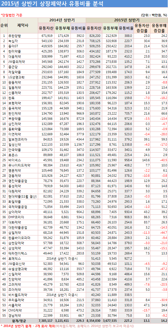 보건의료 분석평가 전문사이트인 팜스코어가 12월 결산 국내 55개 상장제약사의 공시자료를 토대로 2015년도 상반기 유동비율을 분석한 결과(단일법인 기준) 2015년 상반기 기준 평균 유동비율은 227.2%이었다. 유동비율이 평균(227.2%)보다 높은 제약사는 총 30곳(54.5%), 평균 미만인 제약사는 25곳(45.5%)으로 집계됐다.