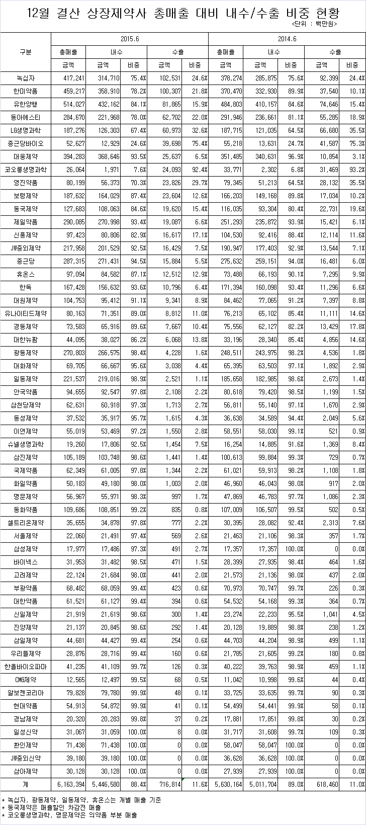 약업닷컴(www.yakup.com)이 12월 결산 코스피 및 코스닥 상장 제약사들의 2015년 상반기 영업실적을 분석한 결과, 충매출 대비 수출비중은 11.6%로 나타났다.