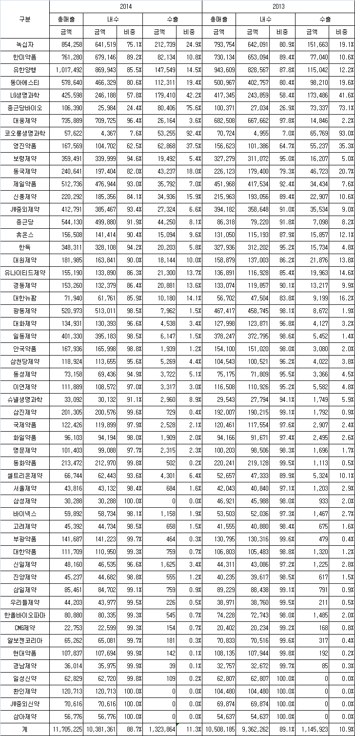 총 매출에서 수출비중이 20%를 넘는 기업은 코오롱생명과학(의약부분 매출 한정시), 종근당바이오, LG생명과학, 영진약품, 녹십자, 동아에스티, 한미약품 등 7개에 불과했다.