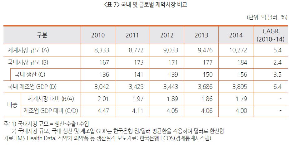 국내 제약시장이 세계시장에서 차지하는 비중은 2010년 2.01%에서 2014년 1.79%로 최근 5년 사이 0.22%p 감소했다. 세계시장 성장률(5.4%)보다 약 3% 낮은 저성장을 보였다.