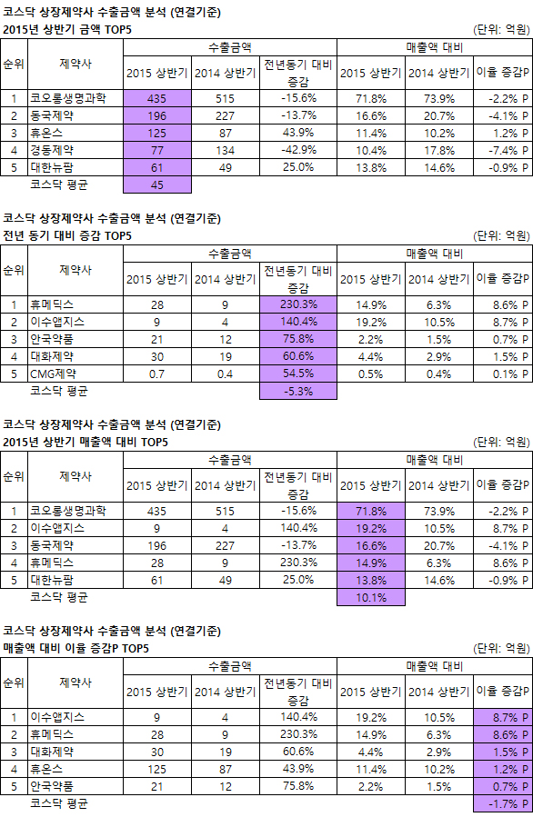 매출액 대비 수출비율은 코오롱생명과학이 71.8%로 가장 높았고 이수앱지스(19.2%) 동국제약(16.6%) 휴메딕스(14.9%) 대한뉴팜(13.8%) 등 5개 제약사를 포함해 코스닥 제약사 모두 10%를 넘었다(평균 10.1%)