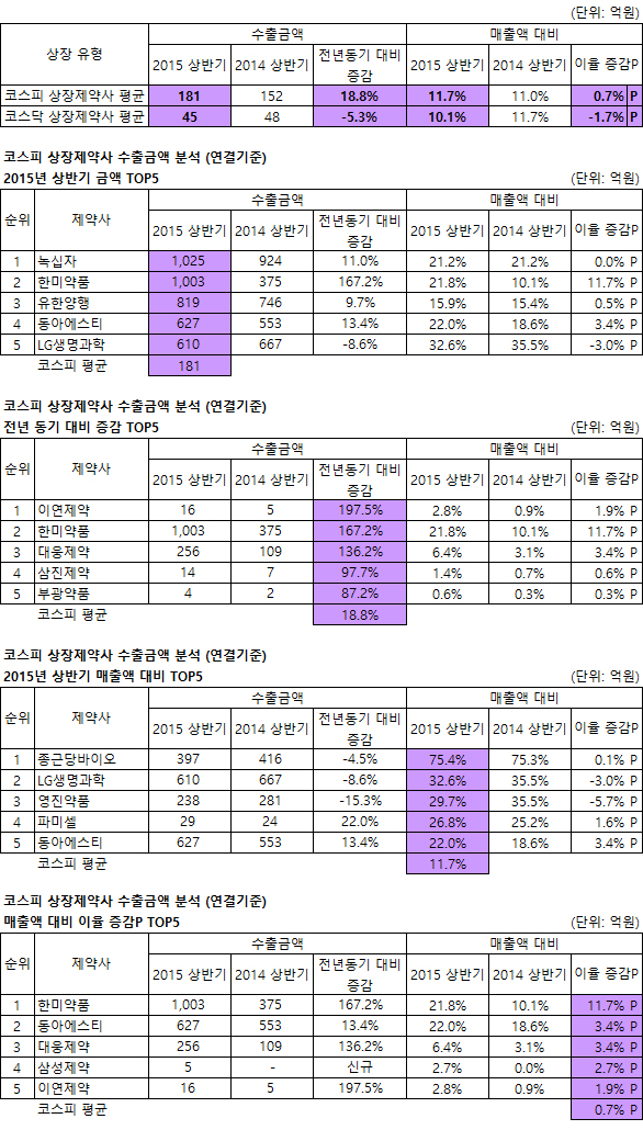 매출액 대비 수출비율은 종근당바이오(75.4%) LG생명과학(32.6%,전년동기대비 감소) 영진약품(29.7%, 감소) 순이었고(평균 11.7%), 매출액 대비 수출비율 증감률은 한미약품이 11.7%p로 유일하게 10%p를 넘었으며 동아에스티(3.4%p) 대웅제약(3.4%p) 삼성제약(2.7%P) 이연제약(1.9%p) 순이었다.(평균 0.7%p)