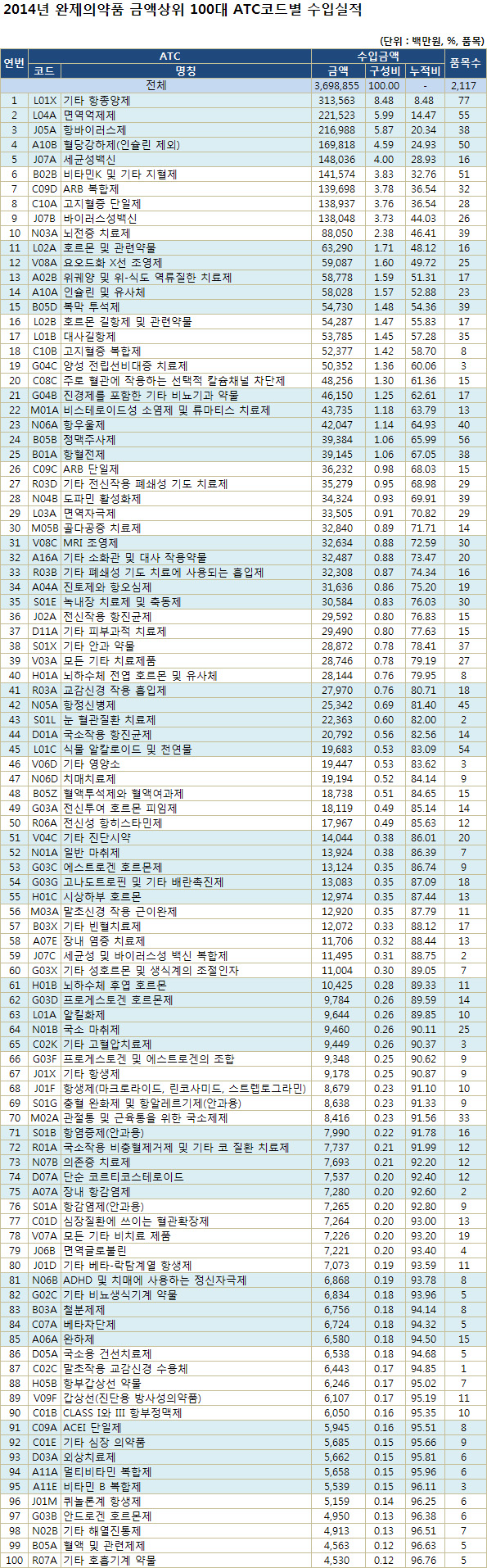 보건의료 분석평가 전문사이트인 팜스코어가 건강보험심사평가원이 공개한 2014년 완제의약품 유통정보 통계집 자료 가운데 금액기준 상위 100대 ATC코드별 수입실적을 분석한 결과다. ATC(Anatomical Therapeutic Chemical)코드는 세계보건기구(WHO)에서 개발한 치료제군별 국제적인 의약품 분류 코드로 많은 나라에서 공통적으로 사용된다.