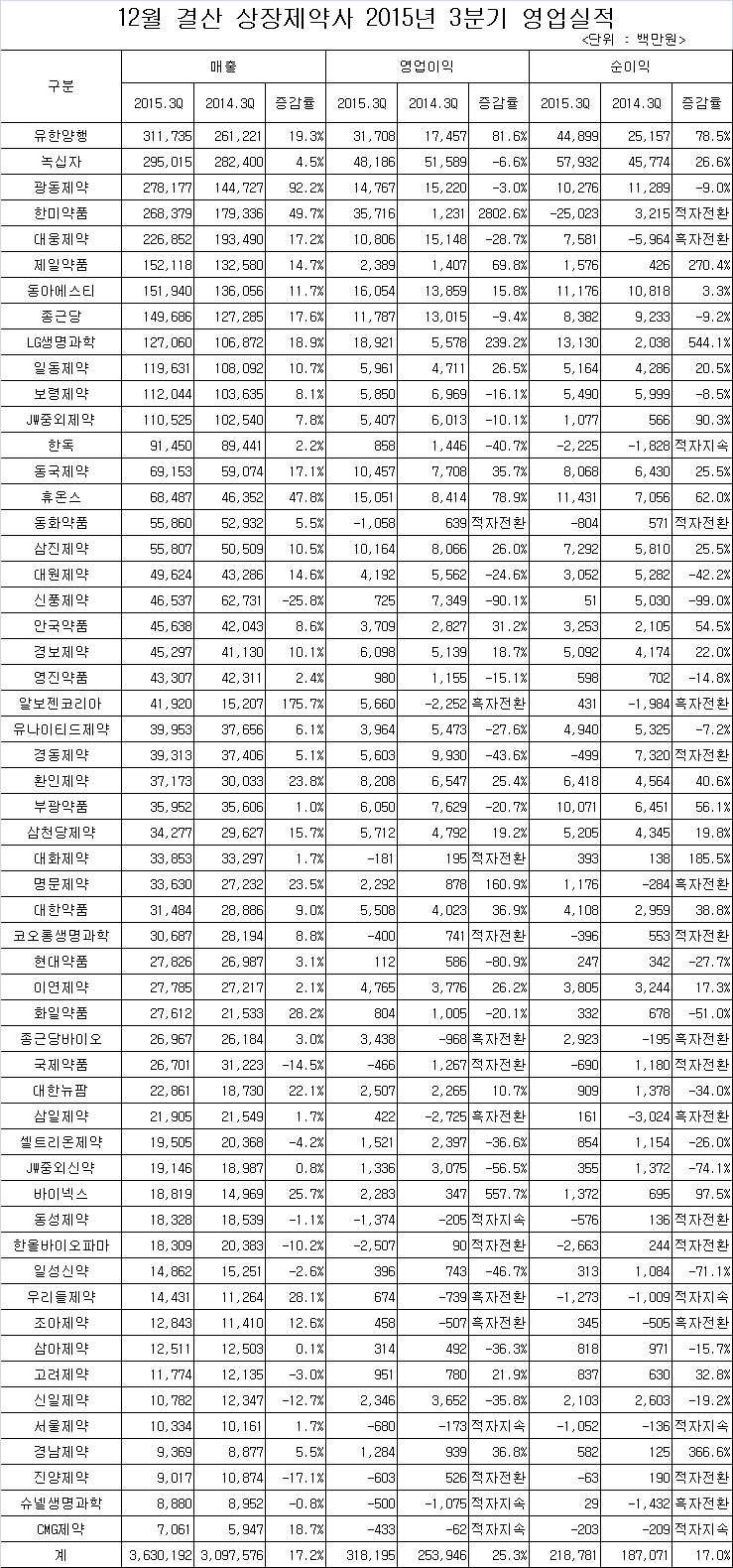 약업닷컴(www.yakup.com)이 12월 결산 코스피 및 코스닥 상장제약사들의 2015년 3분기 영업실적을 분석한 결과, 매출은 전년 동기대비 평균 17.2%, 영업이익은 25.3%. 순이익은 17% 증가한 것으로 파악됐다.