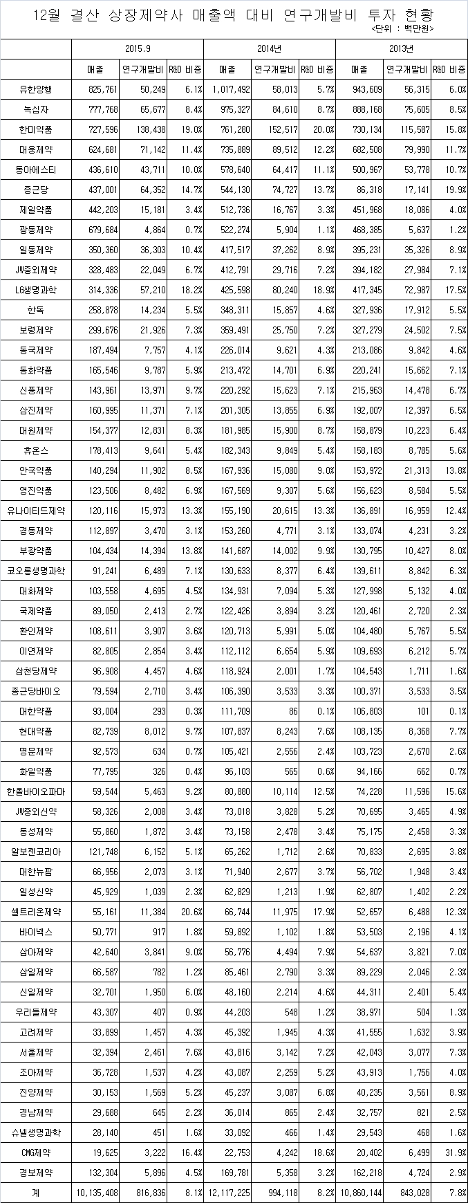 약업닷컴(www.yakup.com)이 12월 결산 코스피 및 코스닥 상장제약사들의 2015년 3분기 실적 보고서를 분석한 결과, 매출액 대비 연구개발비 비중은 8.1%로 나타났다.