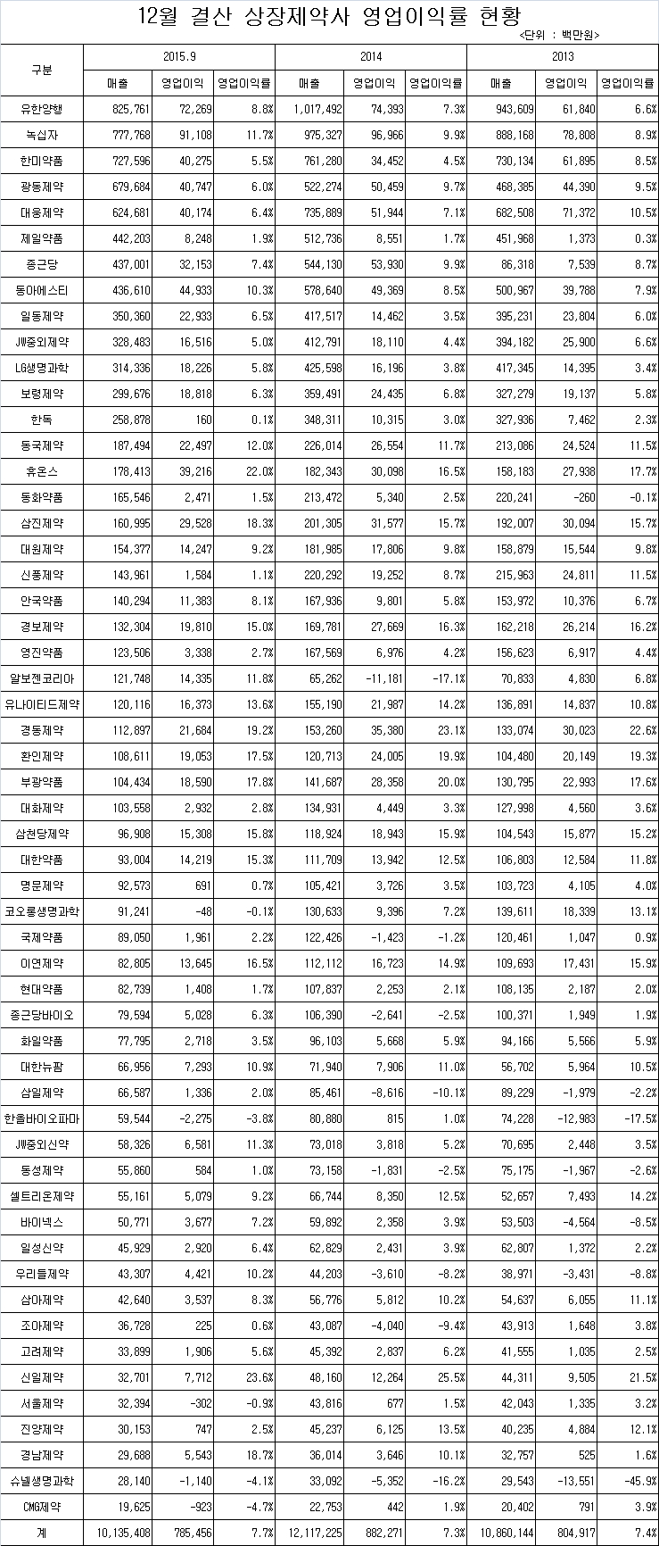 약업닷컴(www.yakup.com)이 12월 결산 코스피 및 코스닥 상장 제약사 55곳의 2015년 3분기 실적보고서를 분석한 결과. 이들 제약사들의 평균 영업이익률은 7.7%로 파악됐다.