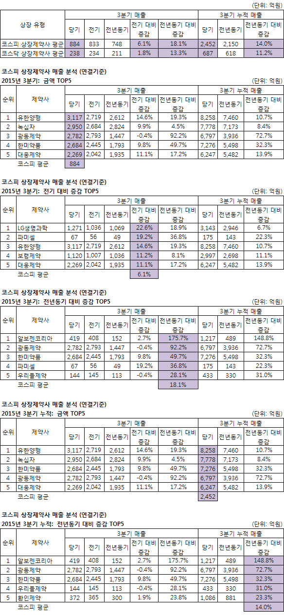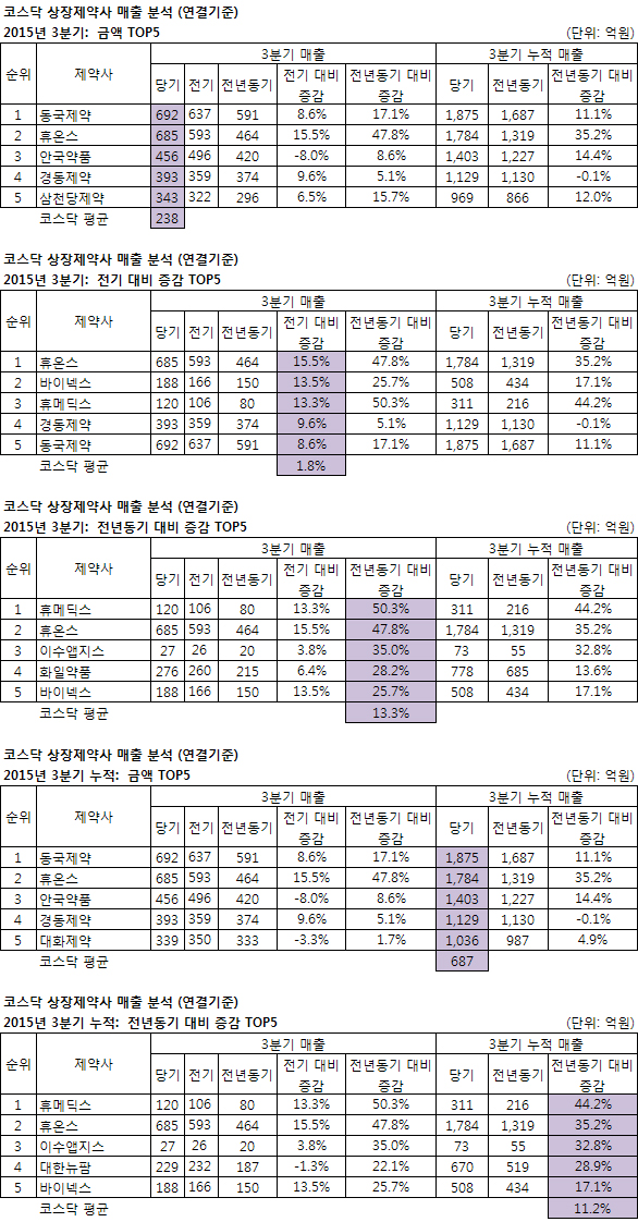 3분기 누적 평균 매출 성장률도 코스피 상장 제약사가 높았다.