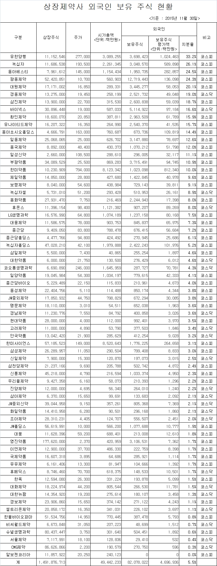 외국인이 보유하고 있는 주식 평가액이 가장 많은 회사는 유한양행으로 1조 245억원이었으며, 한미약품 8,123억, 녹십자 5,899억원, 동아에스티 2,829억원, 한미사이언스 2,647억원, 광동제약 1,361억원, 녹십자홀딩스 1,020억원 등이었다.