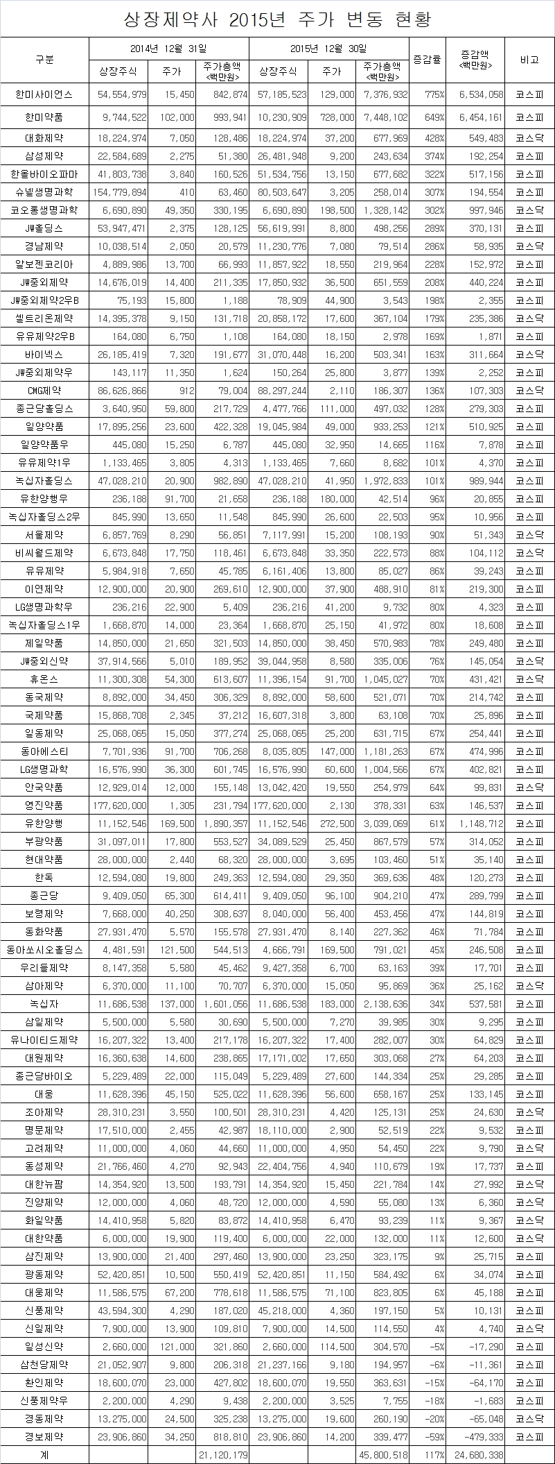 뒤를 이어 대화제약 428%, 삼성제약 374%, 한올바이오파마 322%, 슈넬생명과학 307%, 코오롱생명과학 302%, JW홀딩스 289%, 경남제약 286%, 알보젠코리아 228%,JW중외제약 208% 등 11사의 주가가 무려 200%이상 폭등했다.
