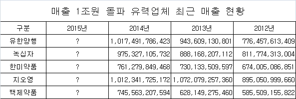 제약업계에서는 유한양행이 2014년에 이어 2년 연속 매출 1조원 이상을 달성했으며, 녹십자와 한미약품이 매출 1조원 클럽에 새로 가입했다.