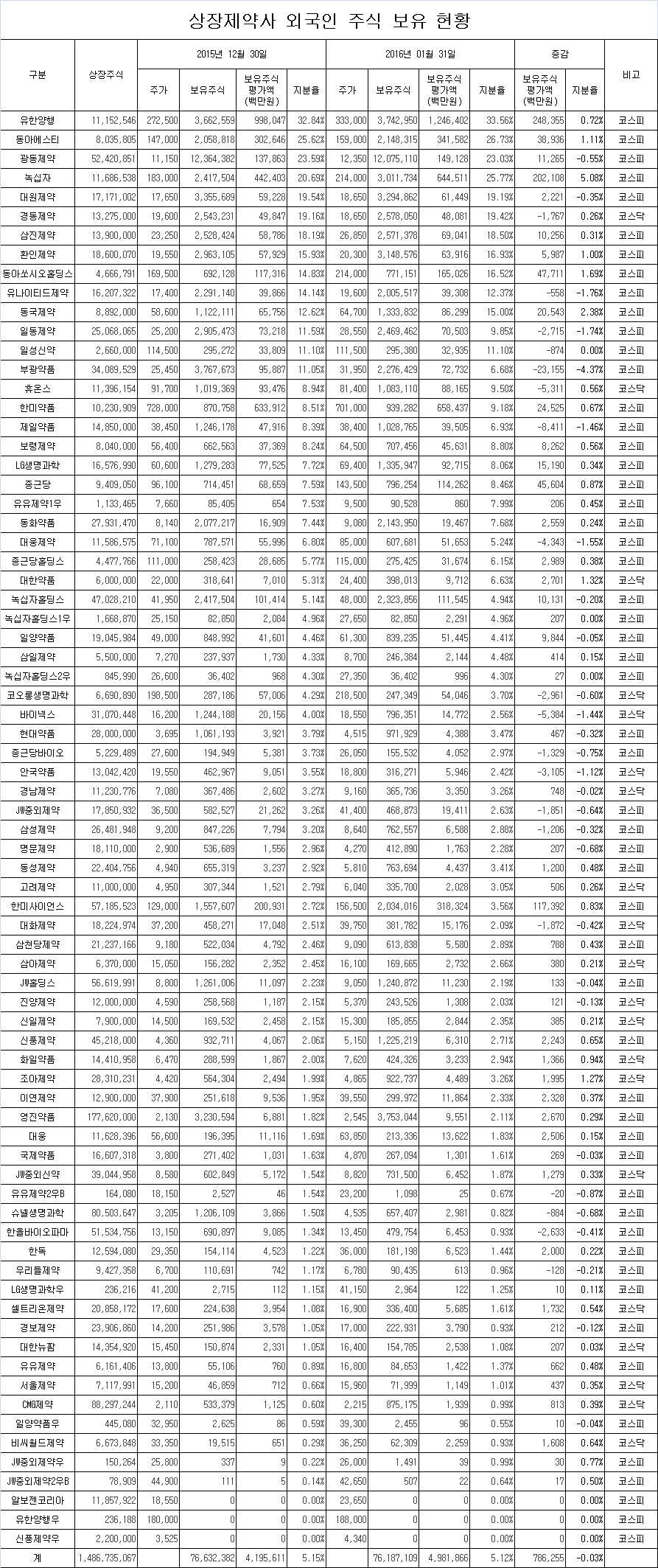 지난해 말과 대비해 제약주의 와국인 지분율은 소폭 감소했다. 지난해 말은 5.15%였으나 1월말에는 5.12%를 기록한 것.