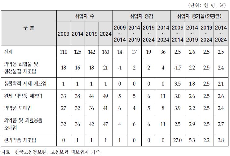 세부 산업별로 인력수요 전망결과에서는 한의약품 제조업, 의약품 및 의료용품 소매업, 완제 의약품 제조업에서 고용증가율이 높을 것으로 봤다.