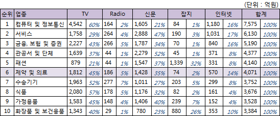 이어 신문 광고 1천428억원 (35%), 인터넷 광고 570억원 (14%), 라디오 광고 277억원 (7%), 잡지 74억원 (2%) 순으로 나타났다.